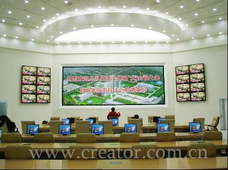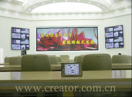 结合本指挥中心的具体使用情况,根据计算机信号和视频信号以及相互交错式的显示,本方案中主要运用CREATOR快捷的ST-7100C无线画中画触摸屏作为主要控制终端,辅用LTX-1200C有线画中画触摸屏;配备CREATOR快捷的CR-PGMII可编程中控主机作为整个控制系统的核心;使用CREATOR快捷的RGB1616、VIDEO1616矩阵切换器进行音/视频信号的相互切换;采用CREATOR快捷的GP-1000图形拼接处理器用2台背投投影机拼接作为显示终端。