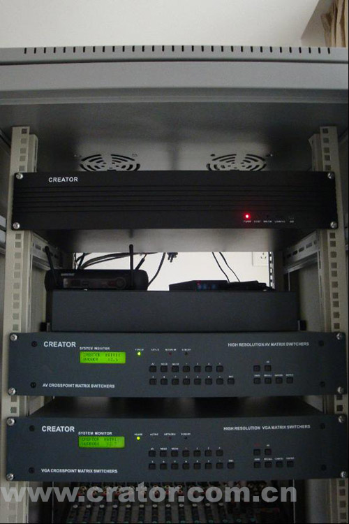 A/V系统由AV矩阵、RGB矩阵、计算机、摄像机、DVD、调音台、话筒、音箱等A/V设备构成。它完成对各种图文信息的播放功能,实现现场音频系统配合投影幕投影系统提供优质的视听效果。并且还可以通过数字录像机,能够将整个过程记录在录像机中,便于以后的查询、回顾等。该检察院通过AV0808和VGA0808这两个矩阵对两个会议厅的视频输入输出设备进行信号的任意选择与切换,既可以选择一对一输出视频信号,又可以一对多进行视频信号的切换。