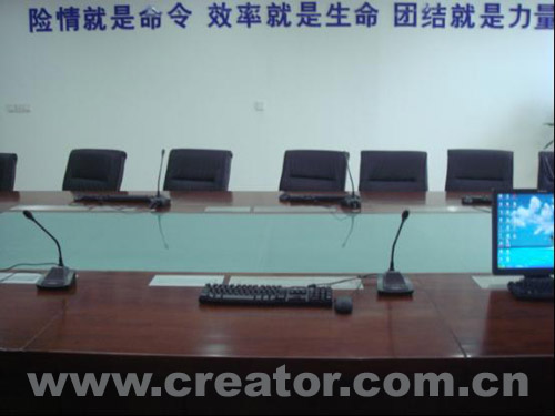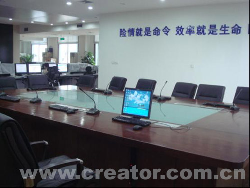 通过中控系统完成对电动幕布、灯光、系统电源、摄像头和矩阵等的集中控制;此套系统还采用了AV矩阵和VGA矩阵作为信号切换载体,很好的解决了输入信号源多又要求保证输出信号显示质量问题的矛盾。此外,还采用了CREATOR快捷最新款四系列桌面式会议系统,高保真的音质效果使整套系统更加完美。