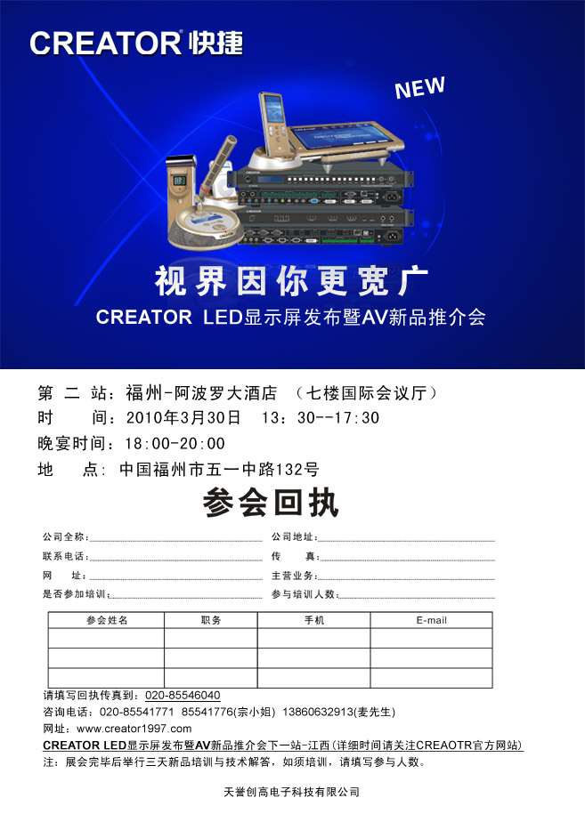 视界因你更宽广• CREATOR LED显示屏发布暨AV新品推介会第二站----福州,即将于3月30日隆重举行,本次巡展为用户与合作伙伴提供现场体验与技术交流的平台,了解产品和系统理念,同时有更多的机会为智能会议系统领域服务。