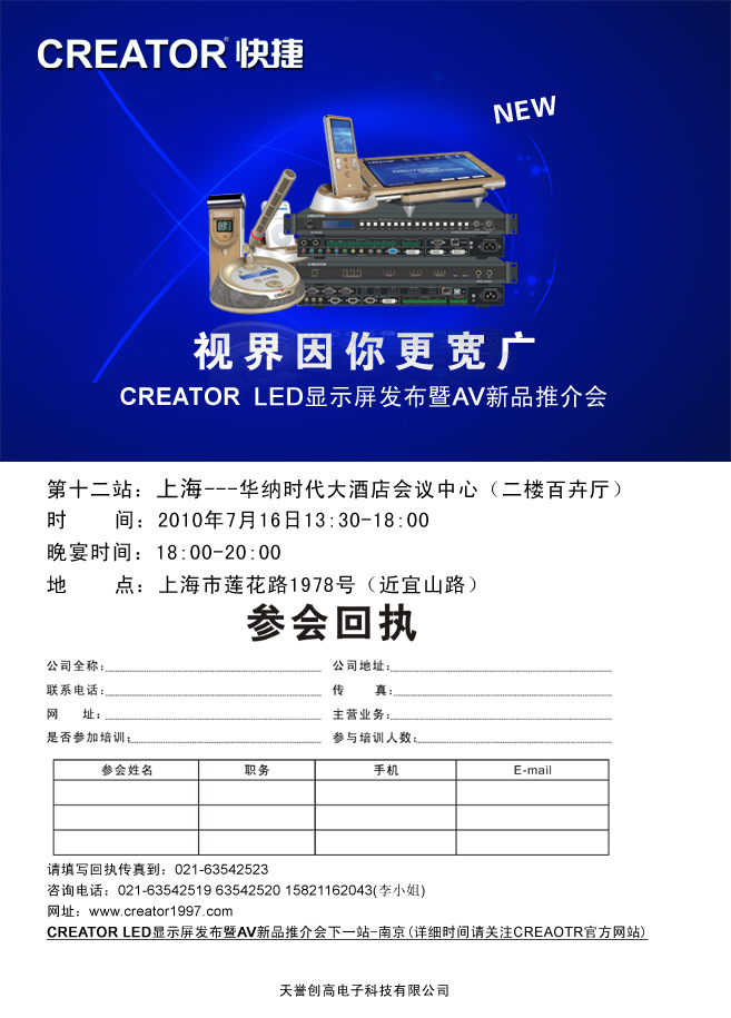 视界因你更宽广 CREATOR LED显示屏发布暨AV新品推介会第十二站----上海,即将于7月16日隆重举行,本次巡展为用户与合作伙伴提供现场体验与技术交流的平台,了解产品和系统理念,同时有更多的机会为智能会议系统领域服务。