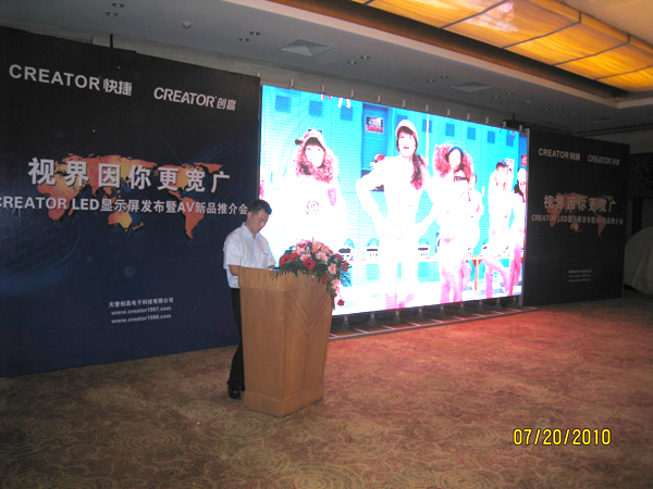 7月20日,视界因你更宽广 CREATOR LED显示屏发布暨AV新品推介会(南京站)在凤凰台饭店(六楼百合花)隆重举行,推介会现场展示了CREATOR快捷最新研发产品:WiFi会议系统、WiFi触摸屏,SPRO-CON9000、 SPRO-CAV801等多款中控主机,CREATOR创高LED全彩显示屏成为全场关注的焦点,其高清的显示效果为此次展会带来了精彩的画面展现……