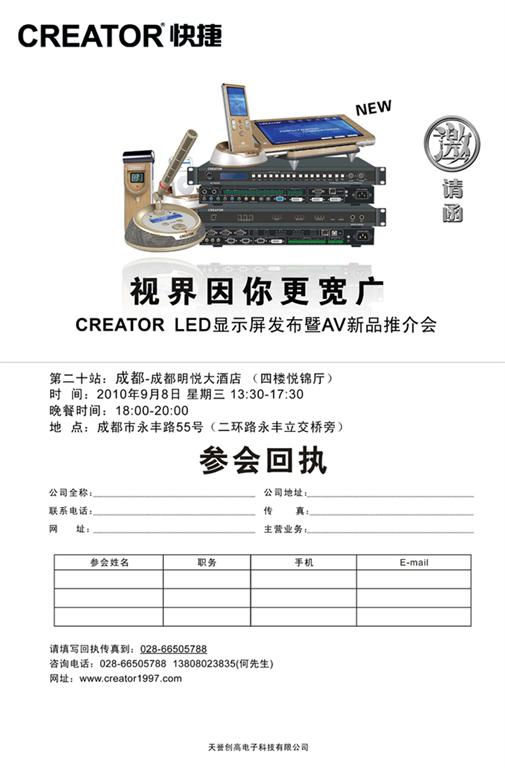 视界因你更宽广• CREATOR LED显示屏发布暨AV新品推介会第二十站----成都,即将于9月8日隆重举行,本次巡展为用户与合作伙伴提供了现场体验与技术交流的平台,了解产品和系统理念,同时有更多的机会为智能会议系统领域服务,真诚恭候大家的莅临!