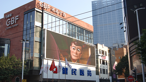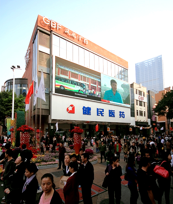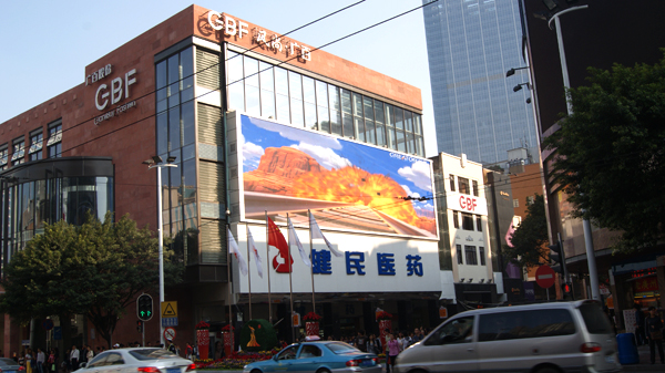 北京路繁华路段最新安装的高清LED显示屏整屏面积高达198.24平方米,由784个CREATORLED高清箱体拼接而成。此屏体亮度高、散热好、可靠性高、寿命长、响应时间短、高精度输出,立体层次感强,画面极其稳定。可任意播放图片、文字、广播、电视、DVD及各种三维动画等。适用于政府广场、繁华商贸中心、广告信息发布牌、商业街、火车站及各种公共设施等场所。