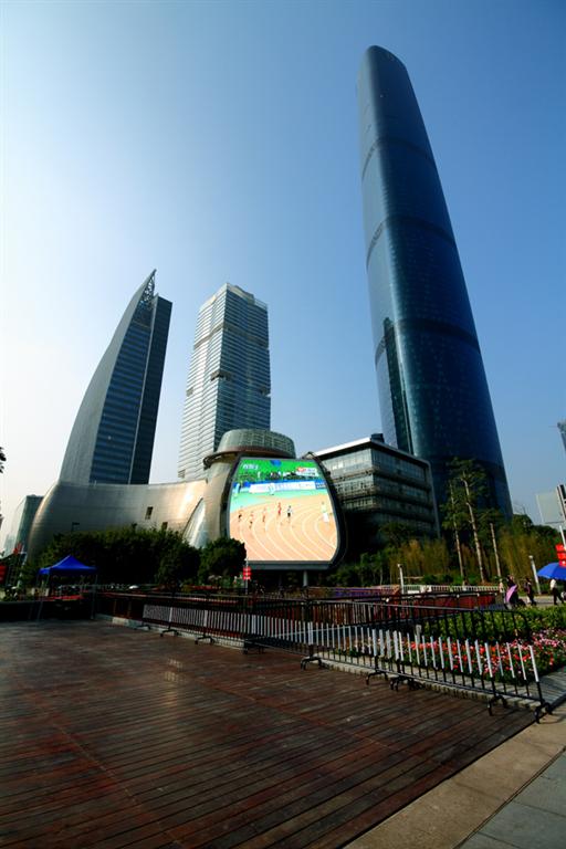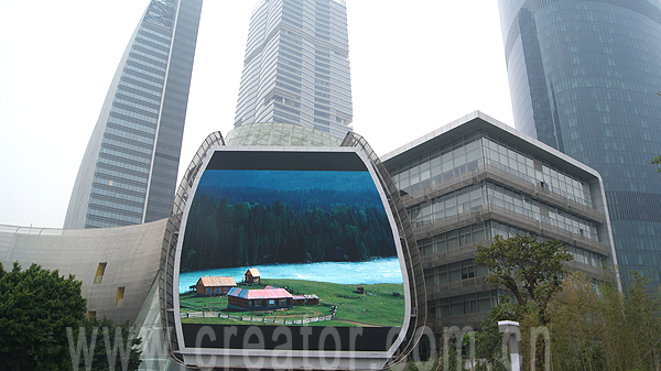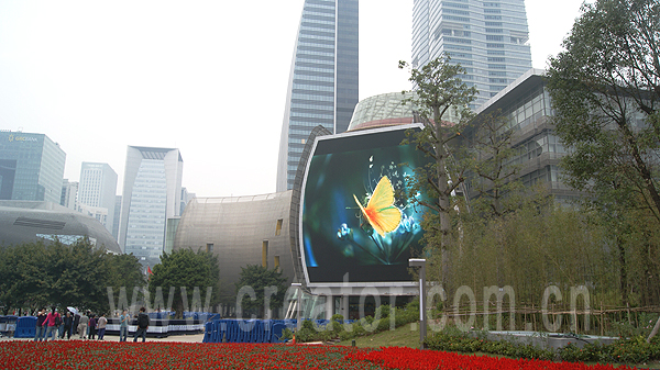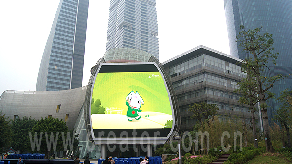 广州第二少年宫网点的CREATOR快捷高清LED大屏,整个屏体面积达481平方米,实际显示面积为460平方米。是目前为止广州最大的屏、亚运最大的屏、第一块可以实现异形处理的屏,开创了多项行业之最。