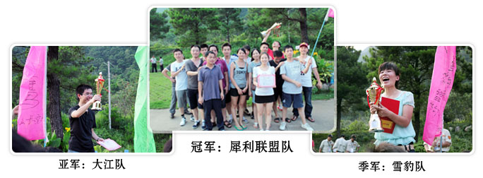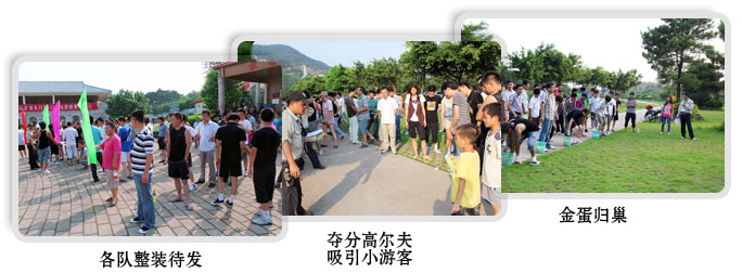 首先是夺分高尔夫项目,每个队员有两次挥杆机会,分数分别为1,2,3分,犀利联盟队果然非浪得虚名,一名队员一挥杆,1分,再一挥杆,3分!全队鼓掌欢呼,第一轮得分遥遥领先其它5队,似乎看到冠军正在向犀利联盟队招手!岂能一枝独秀?其它5队纷纷商讨对策,似乎要将犀利联盟队拉下水。果然,接下来的雪山飞狐项目之后,虽然犀利联盟队并不示弱,但大江队已经大步追来,两队并列第一。在巧夺高分项目里,最重要的是一个巧字,而且要和时间赛跑。在一分钟的准备时间里,各队队员纷纷围成一圈,充分发挥个人智慧和特长,积极出谋划策,并进行实际演练,都为了完成一致的目标而努力。最后进行的是金蛋归巢项目,各队依然是你追我赶,最终犀利联盟还是技高一筹,拿到冠军,大江队名列亚军,季军的荣誉属于雪豹队。