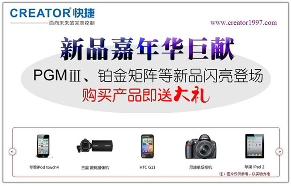值新产品全面上市之际,为了答谢广大新老客户朋友长期以来的支持与厚爱,CREATOR快捷将在全国范围内展开“购买产品即送大礼新品嘉年华巨献”活动。从11月11日起至12月31日,凡是在活动期间一次性购买CREATOR快捷新老产品均有机会赢得CREATOR快捷送出的惊喜大礼一份。产品实惠,礼品超值,打算购买CREATOR快捷产品的客户朋友,千万别错过这个好机会。让您精"智"选择,精致享受!