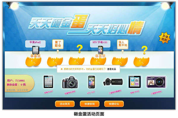 活动给力,参加就得大奖。本次新品嘉年华巨献活动一直持续到12月31日,获得抽奖资格的客户将由CREATOR快捷直接提供用户名和密码,客户只须按照CREATOR快捷提供的用户名和密码进入新品嘉年华活动页面(http://www.tampacardetail.com/pgm3/ index.asp),填写相关信息,即可参与砸金蛋活动,赢取苹果IPAD2、尼康单反相机、HTC时尚手机、三星高清摄像机等丰厚奖品。中奖率高达100%。看过简单、丰厚奖品抽奖规则之后,你心动了吗?那还犹豫什么呢,赶快行动吧!