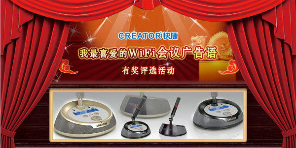 为进一步推进CREATOR快捷WiFi会议产品的知名度,强化公司高端形象,在行业内掀起一场无线会议的创新和革命,CREATOR快捷启动了"我最喜爱的WiFi会议广告语评选活动",欢迎您投出宝贵的一票,如果您有更好的创意,我们愿意聆听您的宝贵意见,感谢您对此次活动大力支持!