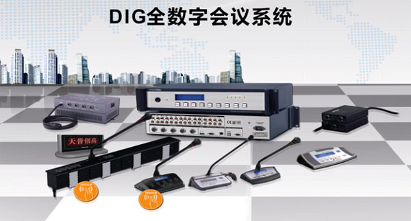 1)DIG5系列全数字会议系统: DIG5全数字会议系列是全数字会议系统,集投同传、表决、话筒管理、显示单元、摄像跟踪、茶水申请、内部通话、短信息等多种技术于一身,采用32bit高速浮点、DSP处理技术。