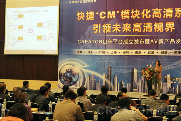 "CM"模块化高清系统 引领未来高清视界——CREATOR快捷2013年山东平台发布暨AV新品发布会4月19日下午在济南万达凯悦酒店隆重举行。下午13:30分参会嘉宾陆续进场,前来参会的嘉宾达数百人。发布会上CREATOR快捷副总经理王国孟先生正式宣布CREATOR快捷山东平台成立并致答谢词,对于优秀的合作经销商颁发了证书,大家在一片轻松欢快的氛围中品读着CREATOR快捷的企业文化。现场展示并讲解了CREATOR快捷最新研发的新品,"CM"模块化高清系统、光纤会议系统、WiFi无线会议摄像跟踪版、网络型中央控制系统。