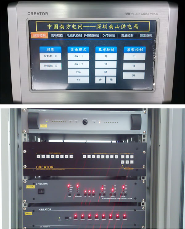 CREATOR快捷PGMIII中控主机配合CR-G7PIP触摸屏控制厅内的所有电气设备,包括控制大屏开关及模式调用、影音设备、信号切换,以及会场内的音量调节等。CR-G7PIP界面上简单明确的中文介绍,只需用手轻触触摸屏上相应的界面,系统就会自动帮你实现你所想做的功能,采用中央集成控制系统大大简化了南山供电局操作过程,使用起来非常方便。