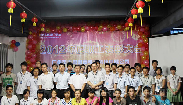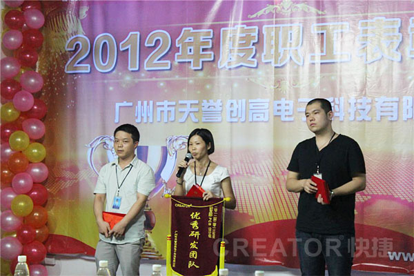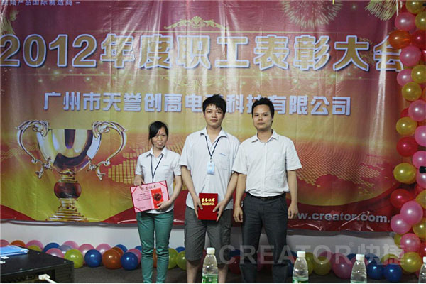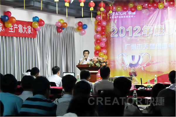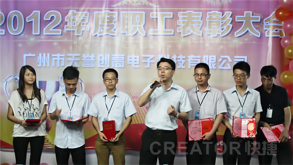 6月9日下午,CREATOR快捷2012年度职工表彰大会在天誉创高广州总部隆重举行,总经理邓涣林先生、副总经理王国孟先生、厂长梁灿华先生、研发总监龙靖先生及各部门负责人近200名职工欢聚一堂,共同见证此次大会的召开。