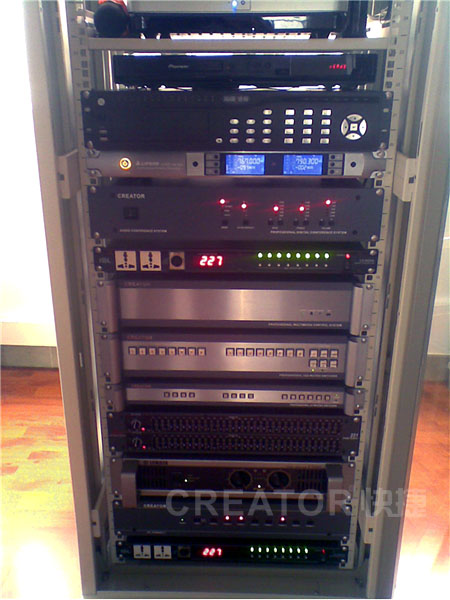 机柜设备配有:DVD,无线话筒,音频处理器,电源时序器,调音台,宝利通视频等。
