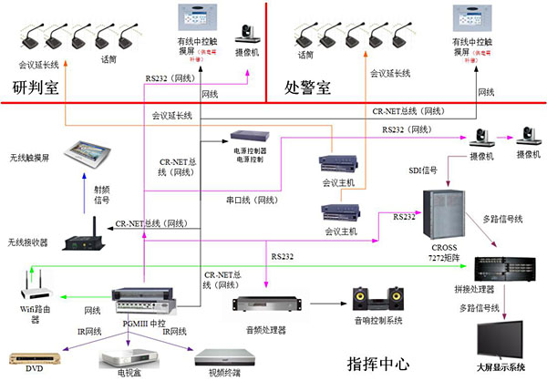 "CM"模块化高清传输与切换系统,让会场所有音视频信号可以井然有序的切换、转换、传输。通过串口连接CREATOR快捷高性能网络化可编程控制主机CR-PGMIII,搭配8英寸手持无线可编程触摸屏CR-Wireless G7pip、4.3英寸嵌入式有线触摸屏MT-430W。(分别安装于研判室与处警室)作为人机交互平台,科学的配置,到哪都能一屏在手,随心掌控。